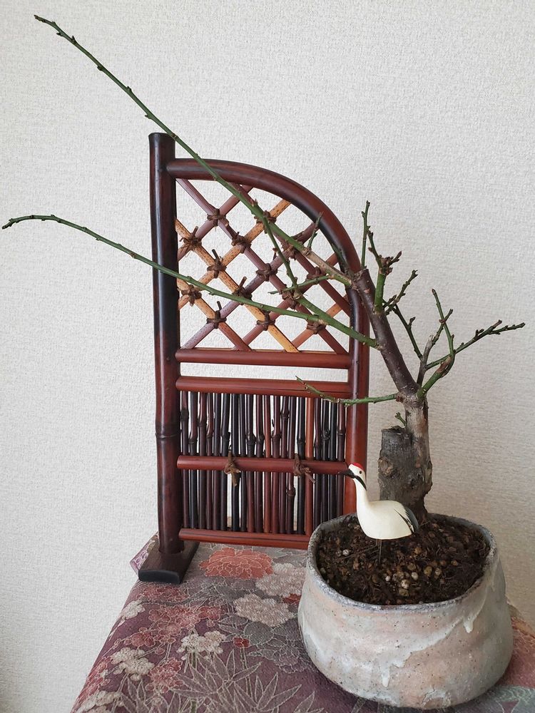 山口市阿知須で今月いっぱい開かれている植木祭り。枝の形に一目惚れした花梅を購入し、きょう植え替えてみました。古道具屋で手に入れたツルの添配がイイ仕事してくれます(* ´ ▽ ` *)
