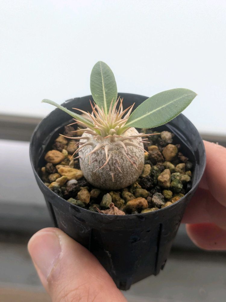 ②パキポディウム・白花恵比寿笑いさん。3枚の葉っぱで耐えています。大事な3枚。早々ちらすわけにはいきません。髪の毛のさみしいおじさんは気持ちよくわかります😁