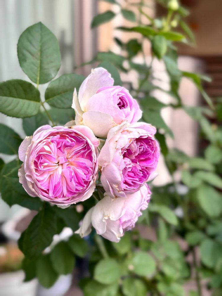 今日は暖かい日で、庭の薔薇も咲き進みました❣️3つの河本ローズ🌹やっぱり可愛いです😍