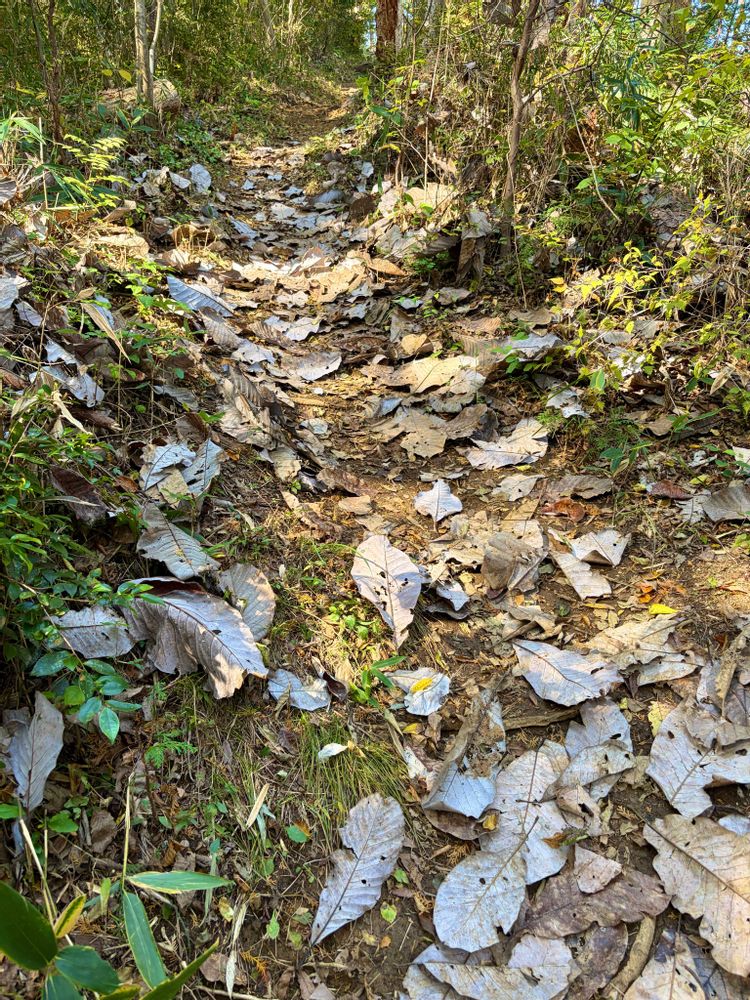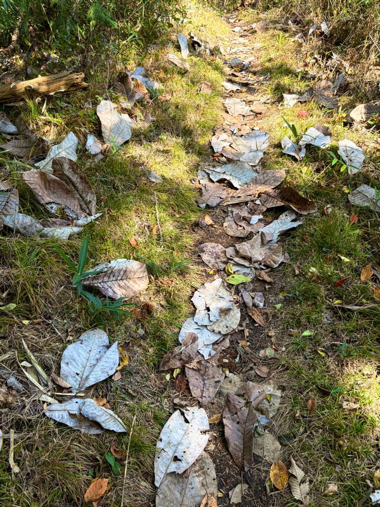 秋の山道を歩いていると、所々で大きなホウバの葉が白い裏面を見せて散り敷いているところがあちこちに…😄 秋だなぁと思います。