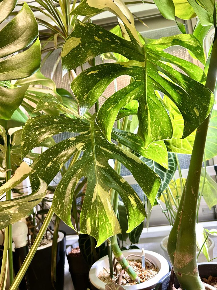 斑入りのモンステラは、どの品種も通常のモンステラよりも葉焼けしやすく、また**暗すぎると斑が消える(先祖返り)**ことがあるため、管理には特に注意が必要です。