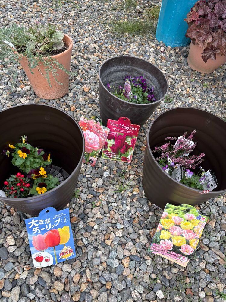 チューリップとビオラ、カルーナ、チェッカーベリーをダブルデッカーで植え付けした。「大きなチューリップ」は5歳児のチョイス。こどもって大きいもの好きだね。
