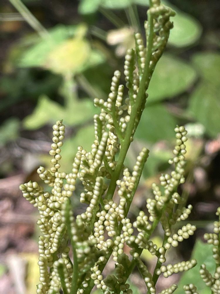 名前は、胞子を作りだす胞子嚢が付く胞子葉を、花に見立てて名づけられてます(ちなみに、英語ではフユノハナワラビの仲間をgrape fernといって、ブドウの房に見立てられてます)。