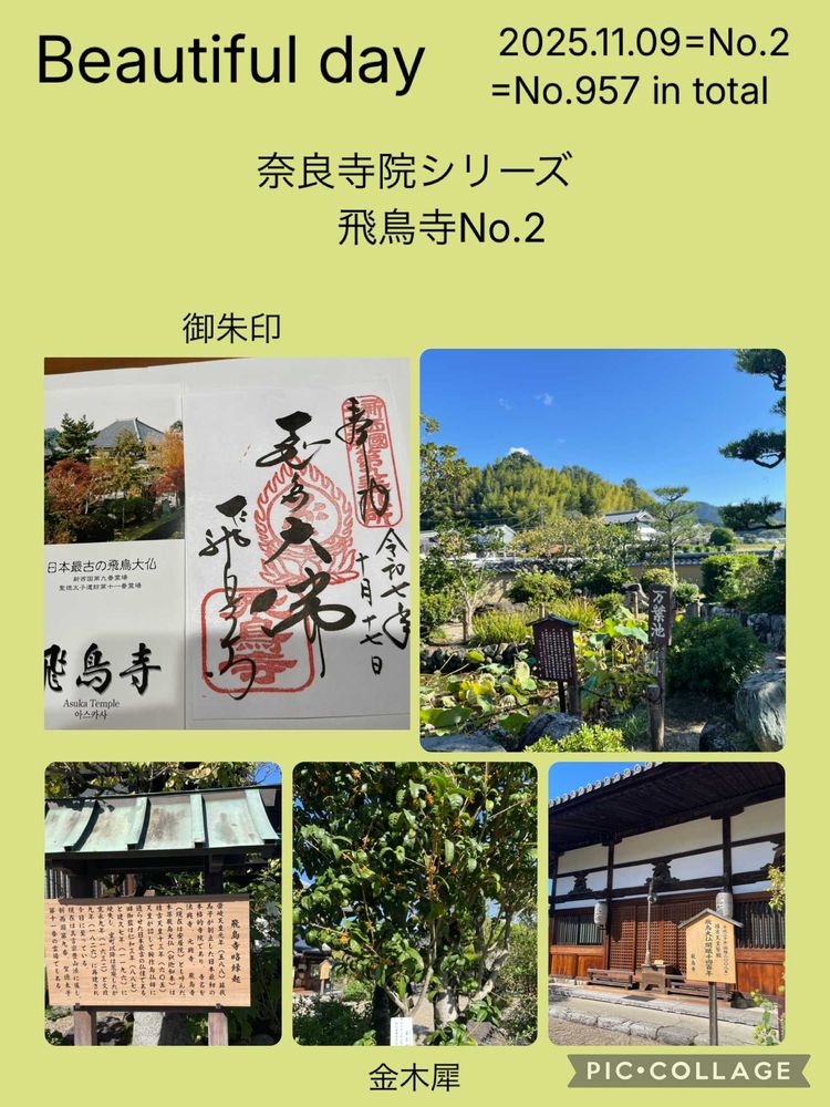 の都が誕生し成立したことを示す考古学的遺跡群です🍀本尊飛鳥大仏は銅15トンなどが用いられている☘️金木犀:(学名:Osmanthus fragrans var aurantiacus )モクセイ科.秋に橙黄色の花を咲かせ甘い香りを放つ 沈丁花、クチナシと合わせて日本三大芳香木のひとつ 花言葉:”真実”.”謙虚”💛💚💛「裏山の径(みち)をのぼりて木犀の香を嗅ぐころぞ秋はれわたる」(斎藤茂吉).(2025.10.17 奈良県高市郡明日香村にて).(2025.11.09 Umakichi style )💐✨✨✨