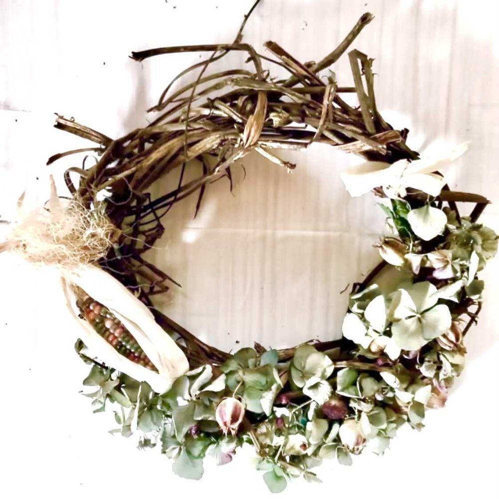 今年は虹色コーン(写真2枚目)も作ったことで、秋色アジサイ・ノブドウ・虹色コーンのリースも今年収穫されたばかりの材料でお作りできます