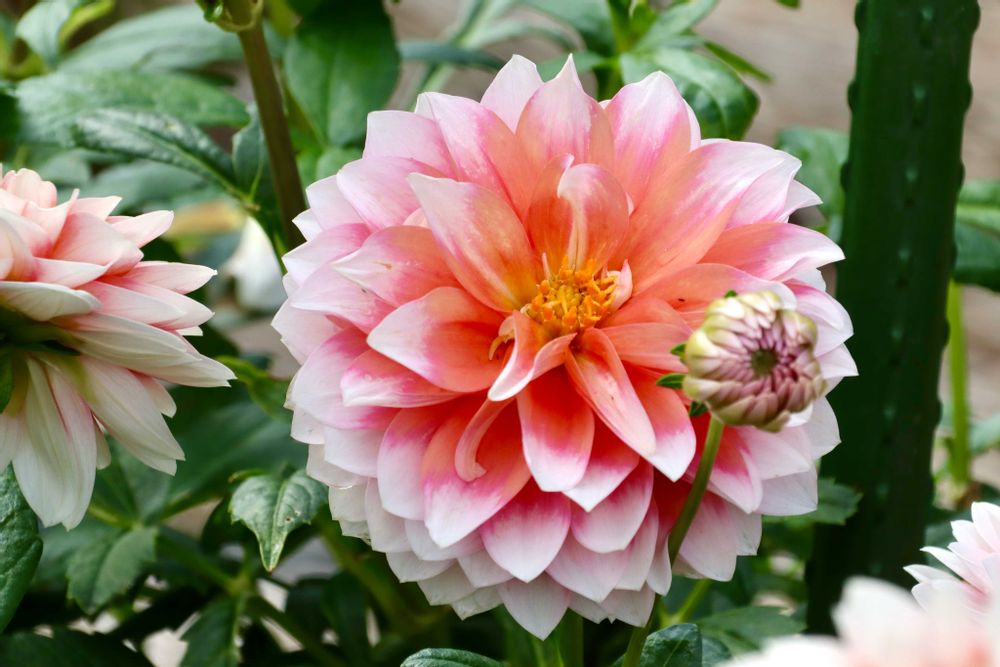 ピンクから花の先端が白くなるグラデーションにオレンジのアクセントが入るダリアさん💗🧡🤍