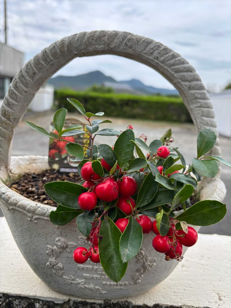 チェッカーベリー🔴 鉢も良いね😃背景に映ってる山々も良い感じ🥰👍