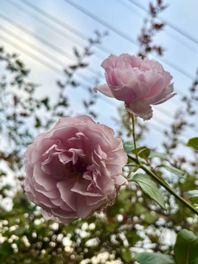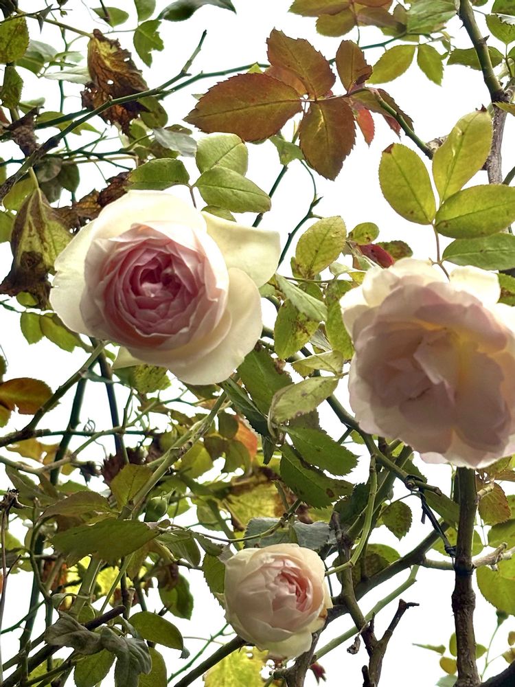 ☔️☁️秋の深まる今日の庭🌹レーニーブルーが秋色に咲く💜シュラブバラは2m越えで見上げる感じ😅