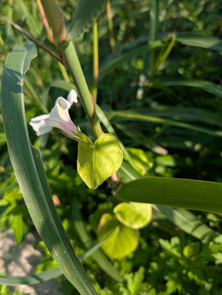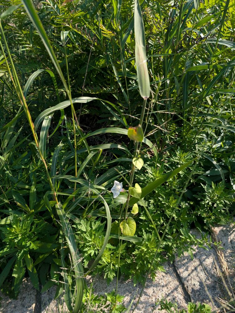通勤途中で川沿いを歩いていたら、(多分)アサガオ⁉️が(多分)葦⁉️に巻き付いて、1輪だけ咲いていました🧐