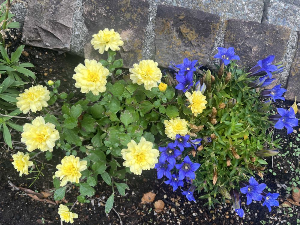 家の黄色のガーデンマムとリンドウが綺麗に咲いています✨✨