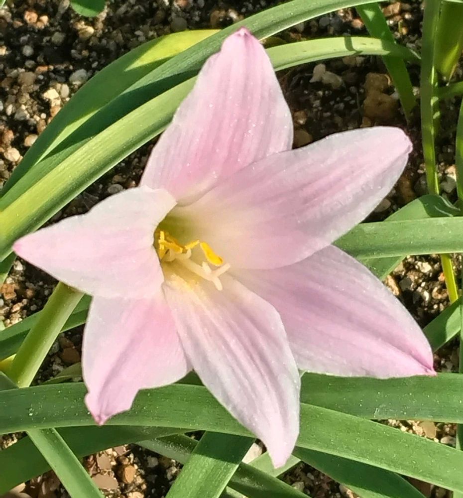 タマスダレは白い花が上向きに咲き、ハブランサスはピンクの花が横向きに咲くのだそうです。