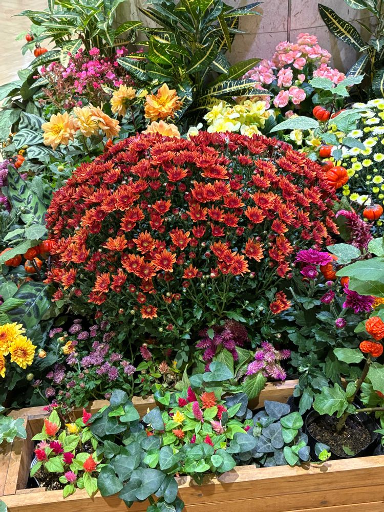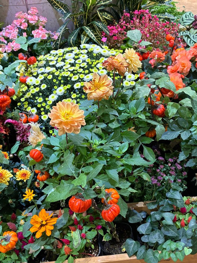 さんちかタウンの色とりどりの、ダリアにマム、明るく華やかで素敵です💕