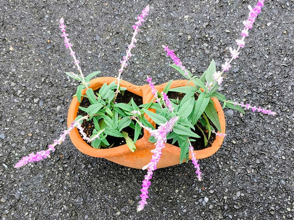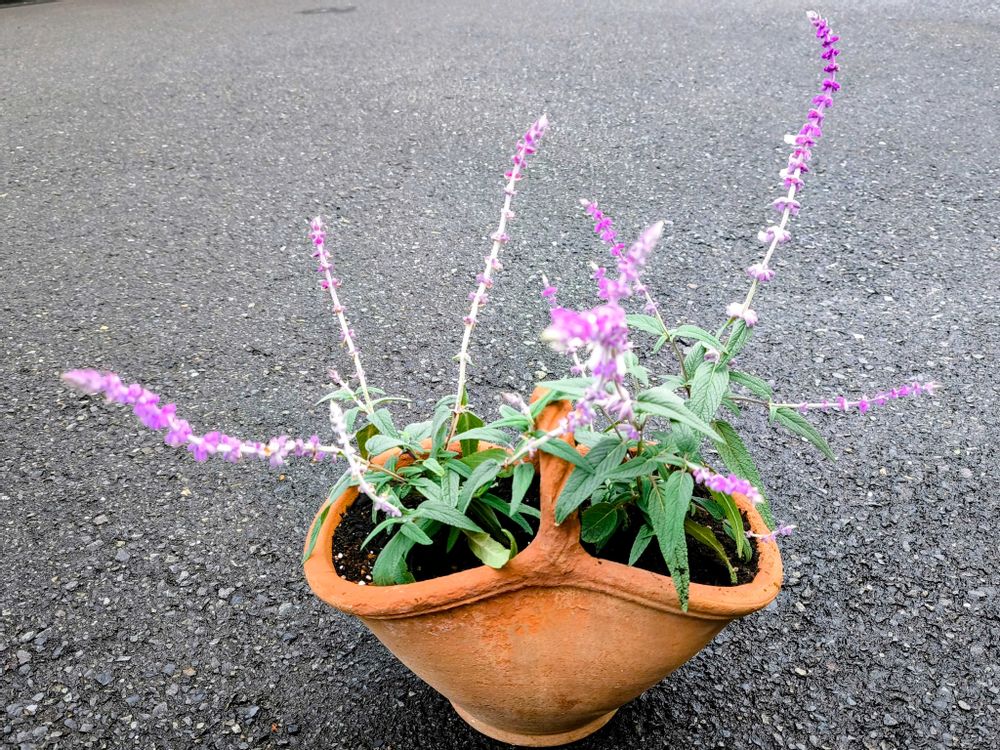 10月25日に届いたモニター当選のメキシカンブッシュアメジストセージ✨、とりあえずこんな感じで2苗を同じバスケット風の素焼き鉢に入れてます🙂