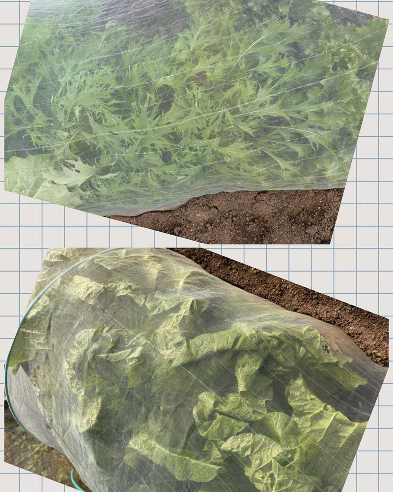 ③ネットの中の白菜や水菜が苦しそうです 水菜は収穫して✂️またネットをかけました 🐛は油断できません