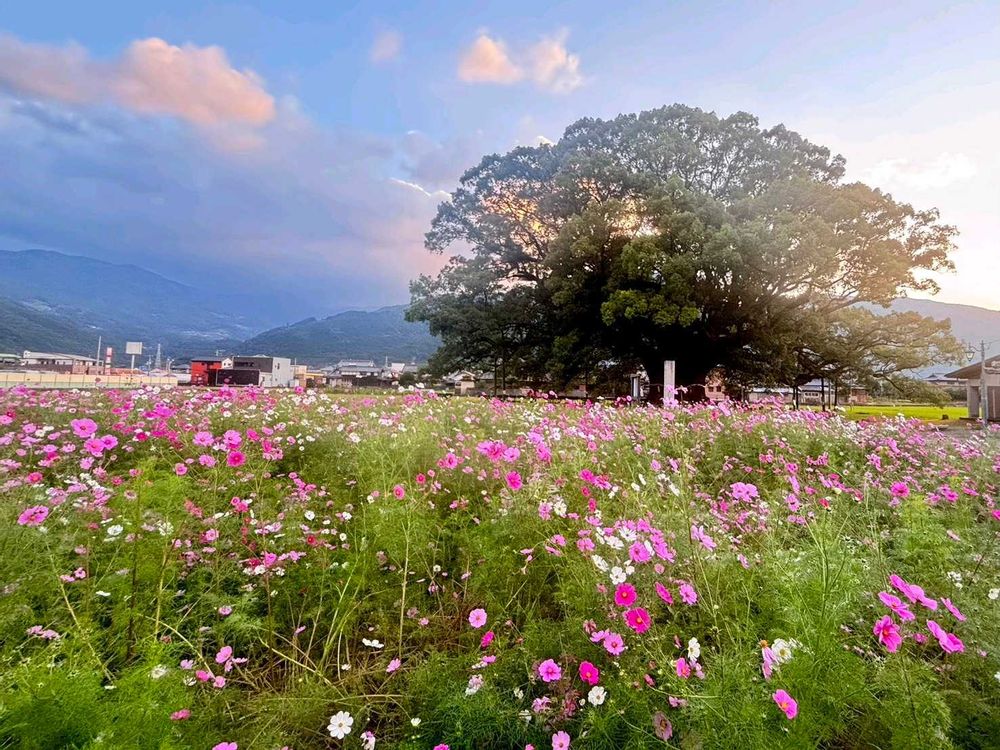 田舎の街のシンボル、大楠と手前に広がるコスモス畑がとてもキレイでした🤗💞💞