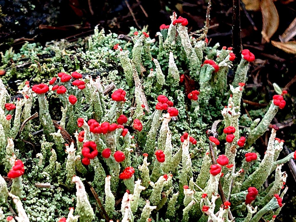 コアカミゴケ何年か前初めて長野で出会いました。切り株にたくさん生えていて赤い帽子をかぶっているみたいで可愛いくてスマホで写真を撮ったのを覚えています