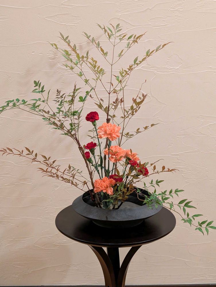 谷津山にて南天もあるので収穫オレンジカーネーションを菊に替えて、ミニカーネーションで練習してみます