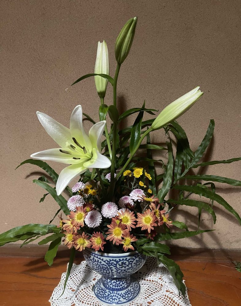 仏壇に飾ったりして、1本だけ菊の花と飾りました。白の百合の花は、どんな色の花にも合うので、いいですね!