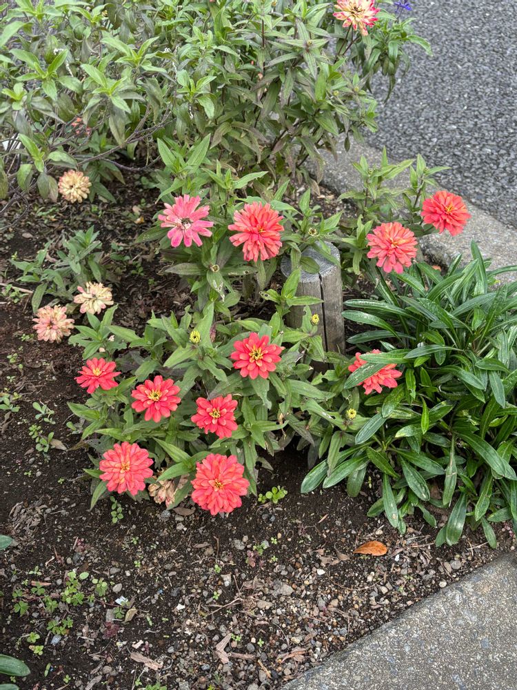 百日草(ヒャクニチソウ)も咲いていました。ジニアとも呼ばれてます。懐かしい花です。ガキンチョのとき、お袋が庭で育てていました。そのときは確か一重。今は、八重どころか花びらがもっと多い品種もあるようで、豪華になりましたね。この子の何とも言えない色合いが素敵です😊