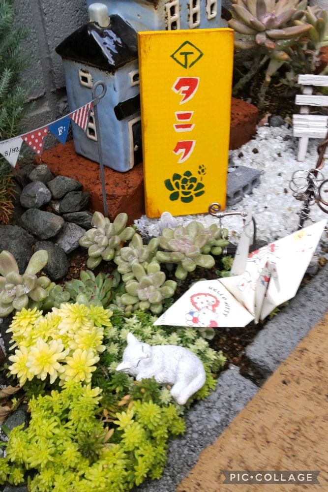 折り紙の鶴さんの隣でセダムの絨毯の上で寝ているネコちゃんの置物🐈