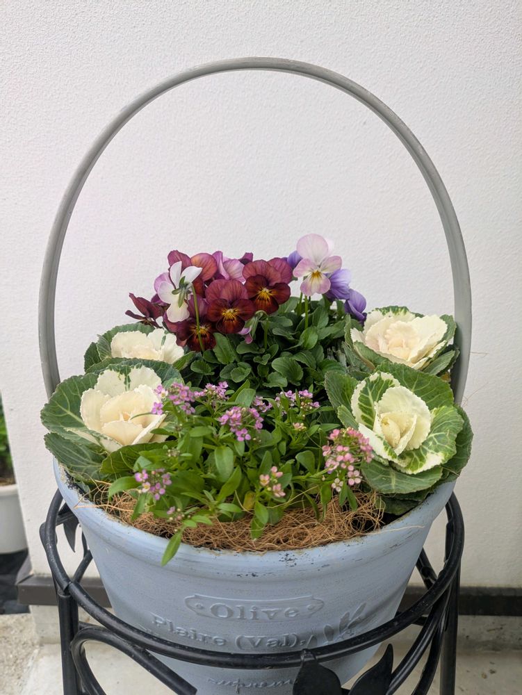 3色ビオラの一株と葉牡丹、ミックスアリッサムで寄せてみました🥰