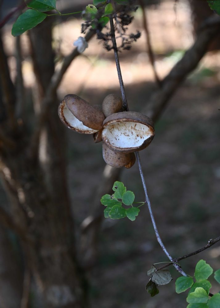 秋に熟すると、緑色から紫色または赤紫色に変化し、果皮が裂開して中にゼリー状の果肉がある。