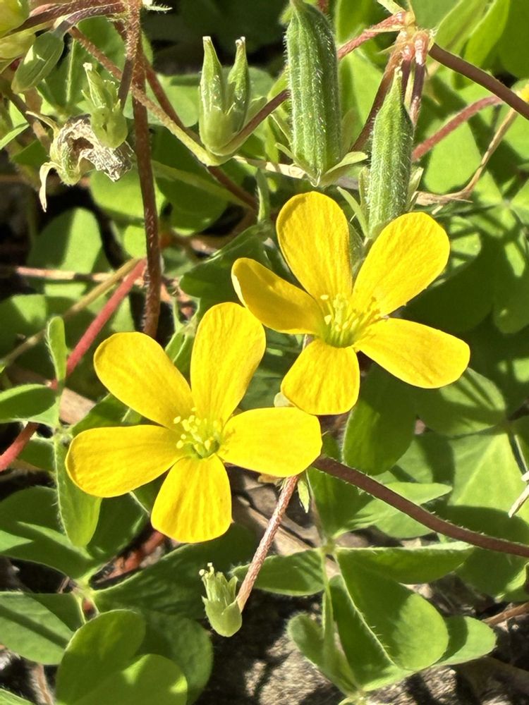 秋晴れの日、川の近くの緑地で、イモカタバミ、カタバミ、ヒメツルソバ、シバザクラが元気に咲いていて嬉しくなりました。