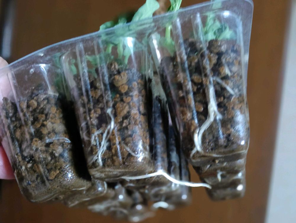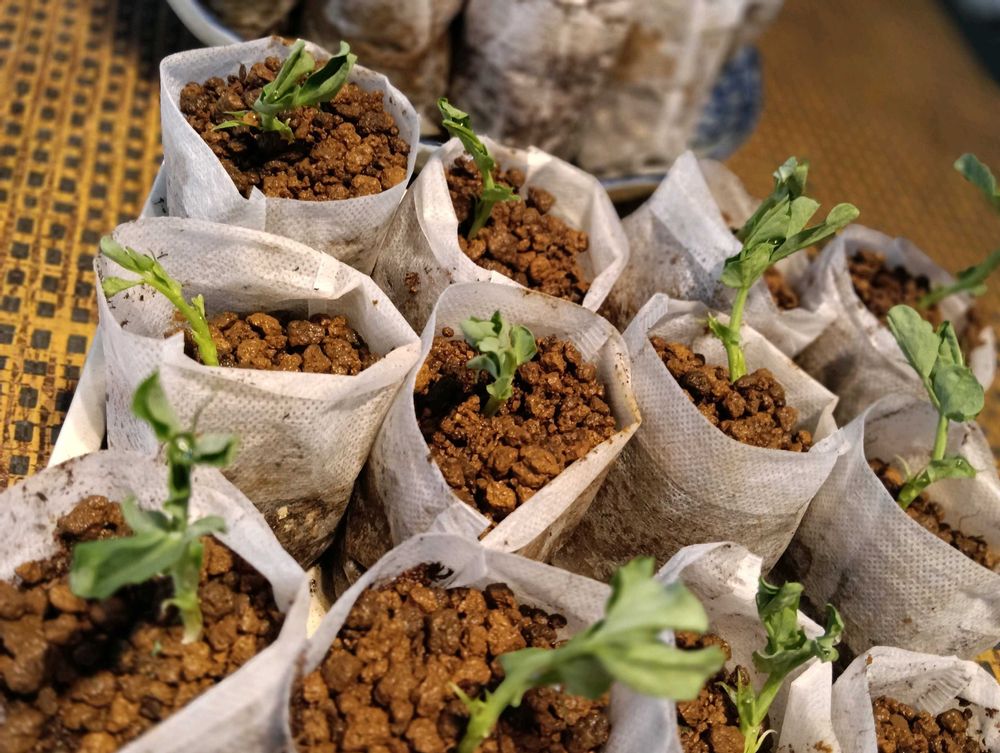 スナップエンドウの赤ちゃん 苗をお茶パックに植え替えしました。