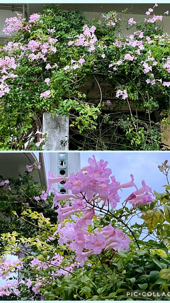 クイーンネックス🩷でも流通していますね😅お迎えして10年ほどの古株ですね🌿🩷🌿ピンクノウゼンカズラの様にアーチ状のトンネルに仕立てたいのですが…今はブロック塀に這わせています🌿