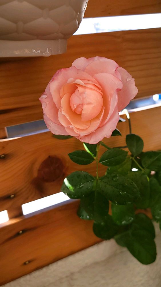 ノスタルジーは本来、赤い縁どりのバラのハズですが、なぜかサーモンピンクなバラが咲きました😅