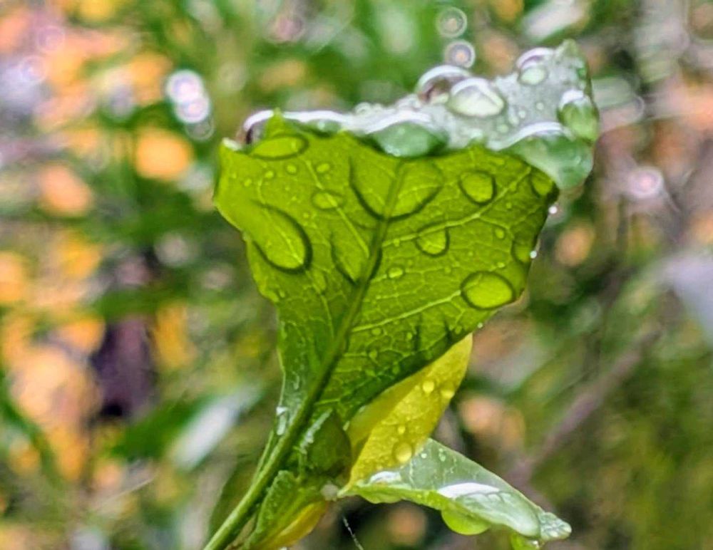 瑠璃茉莉の蕾と葉っぱに雨のお土産…