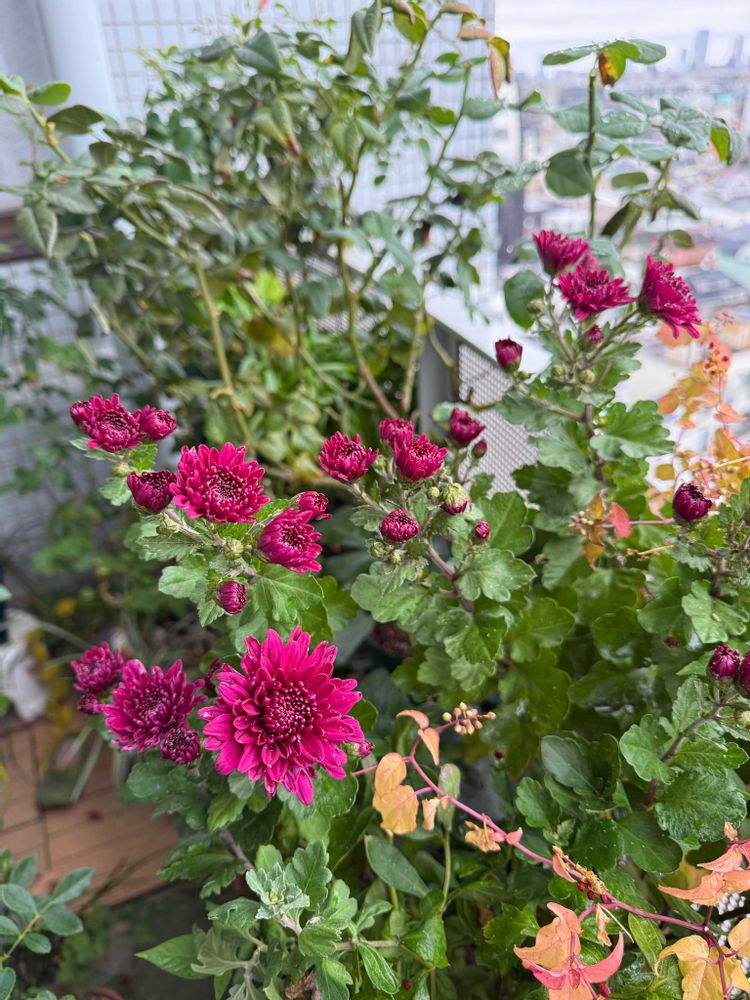 一年目は小さいマムだったので、寄植えに使いました。2年目は挿し芽してニ鉢になりました。これは背が低い方の鉢でジュズサンゴと一緒の鉢に植えてます。