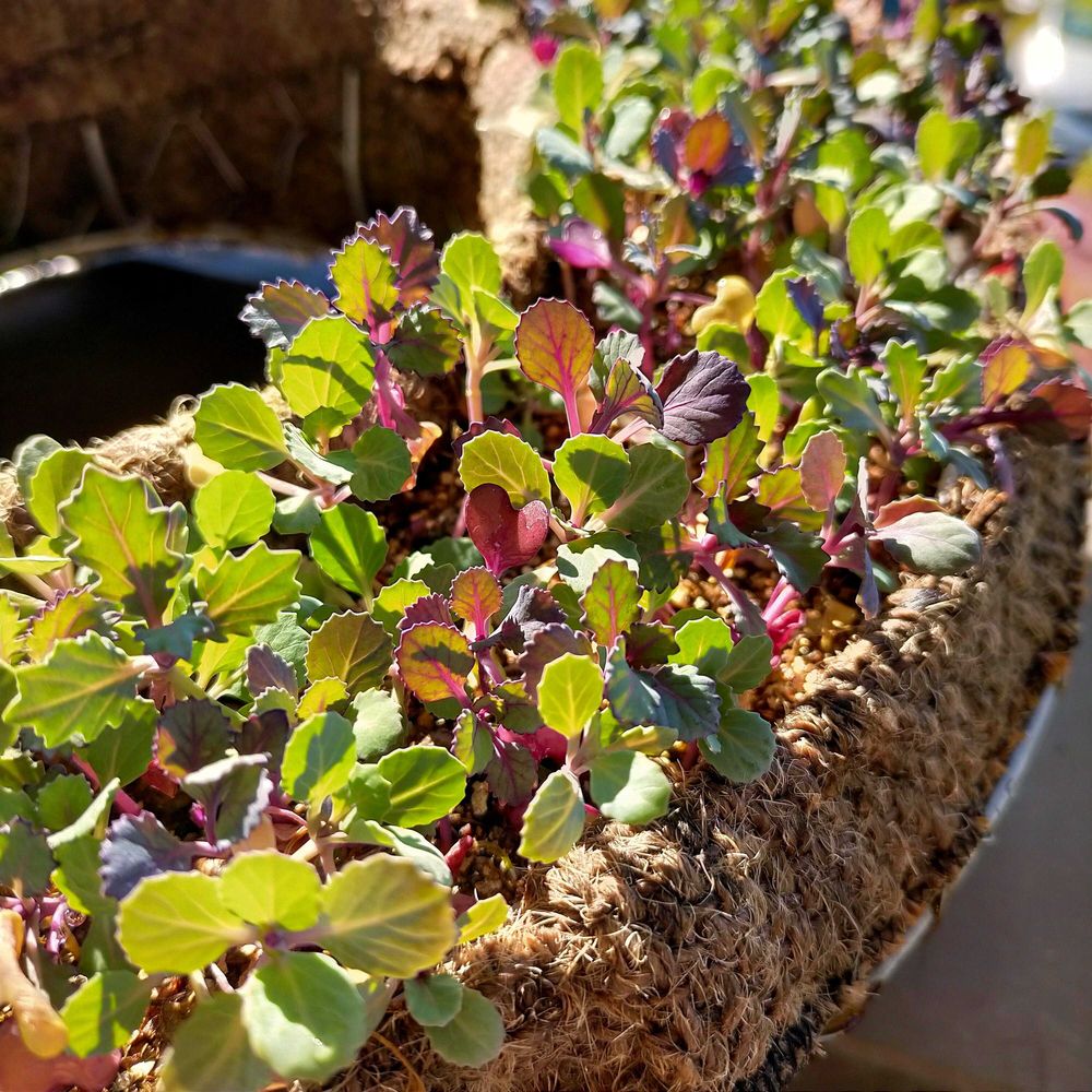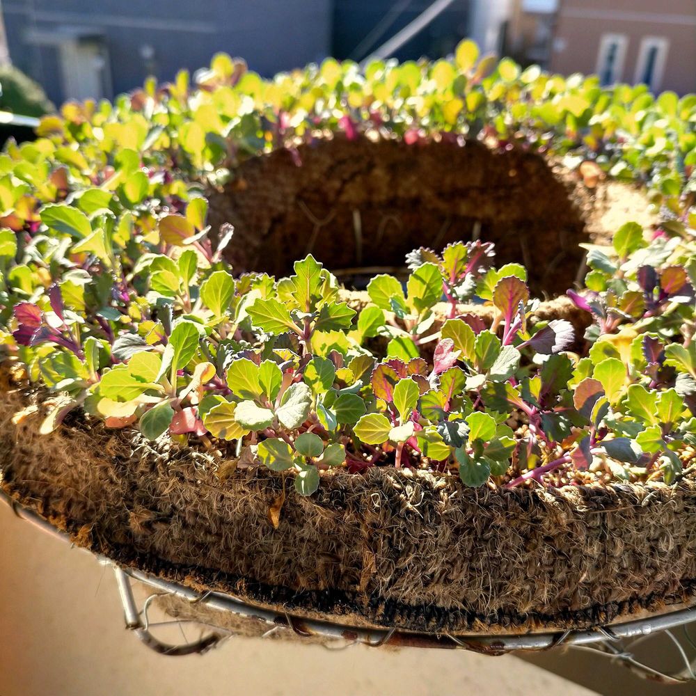 【1枚目】直播き葉牡丹リースは何とか持ち直し、元気そうな様子が見られるようになりました。良かったー😌 9月16日種まきから56日目/1ヶ月と25日目。