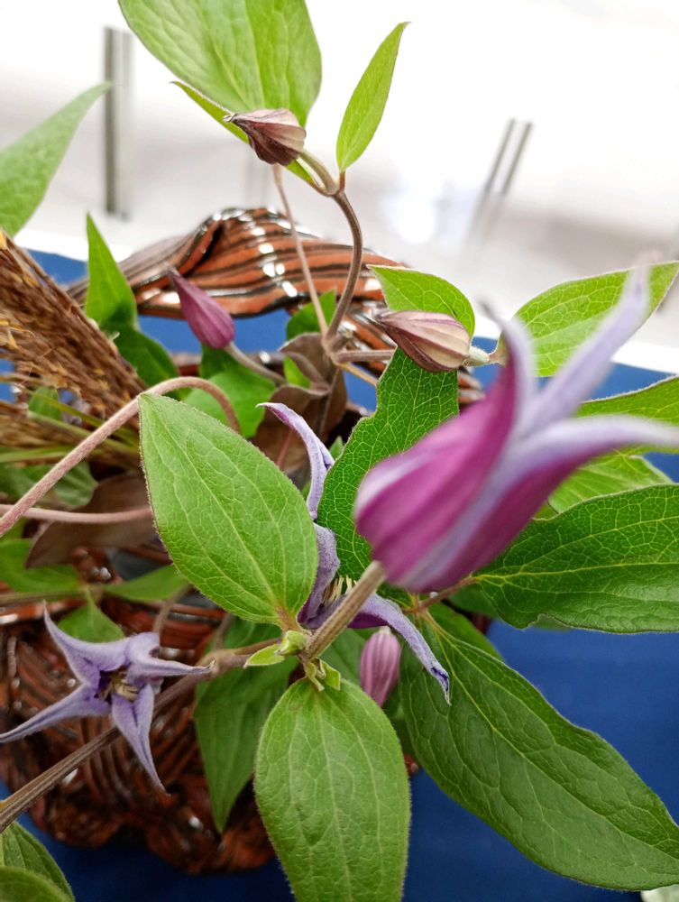 陶籠に活けられた ベル咲きの💜クレマチス・ブルーピルエットの花が素敵だったから📸パチリ!①②