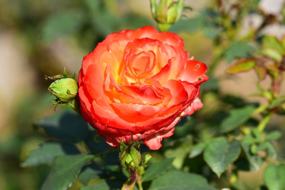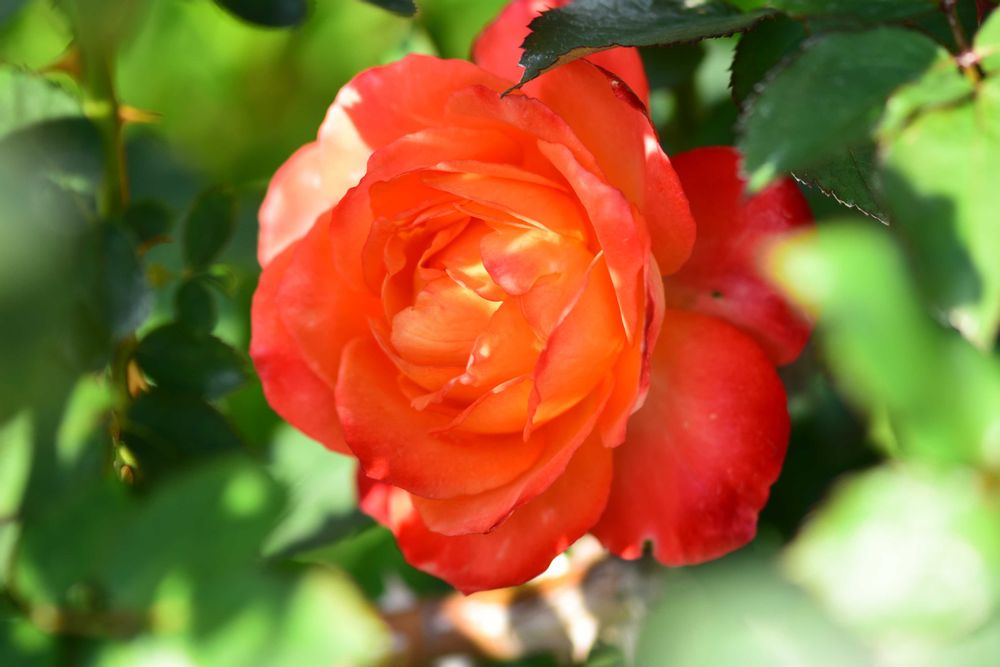 ※鮮やかな朱色がかかるオレンジ色の四季咲きバラ
