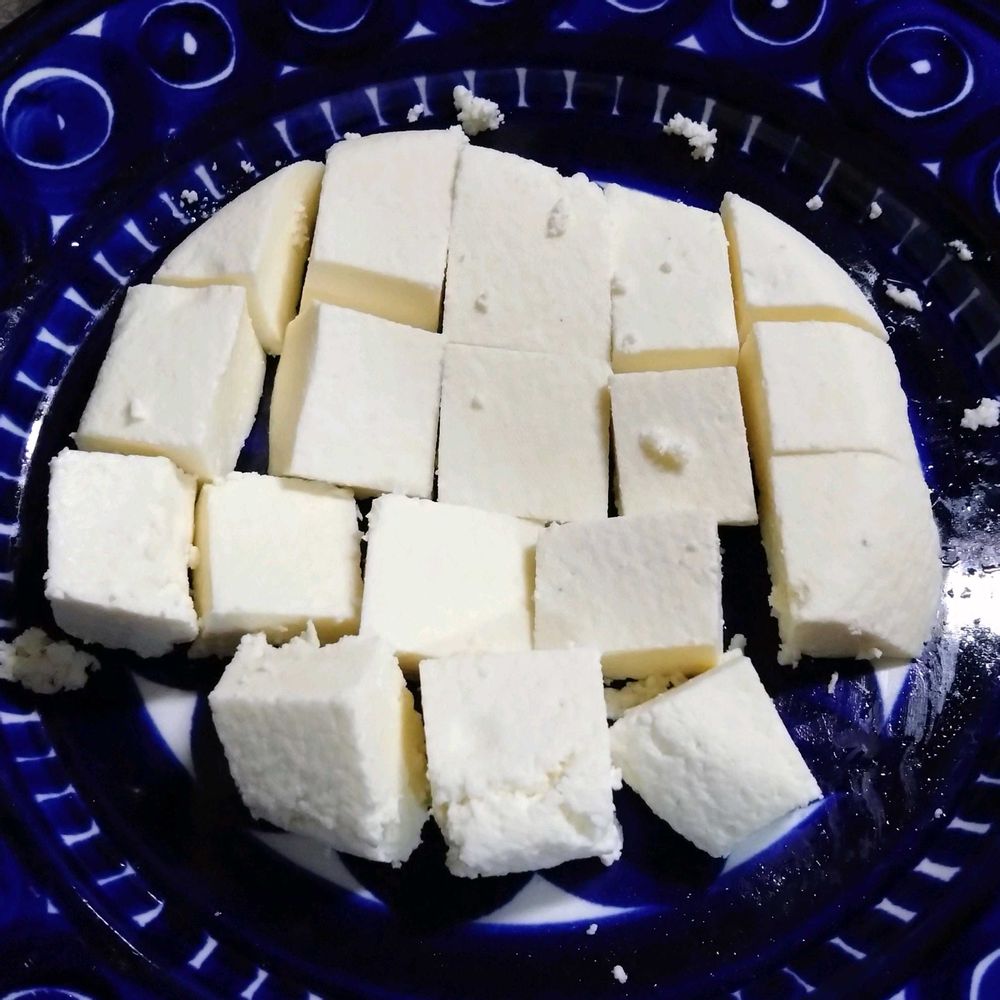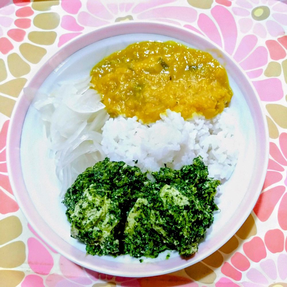 牛乳とレモン汁、塩で初めて作ったパニール(カッテージチーズ)を入れたほうれん草カリーと
