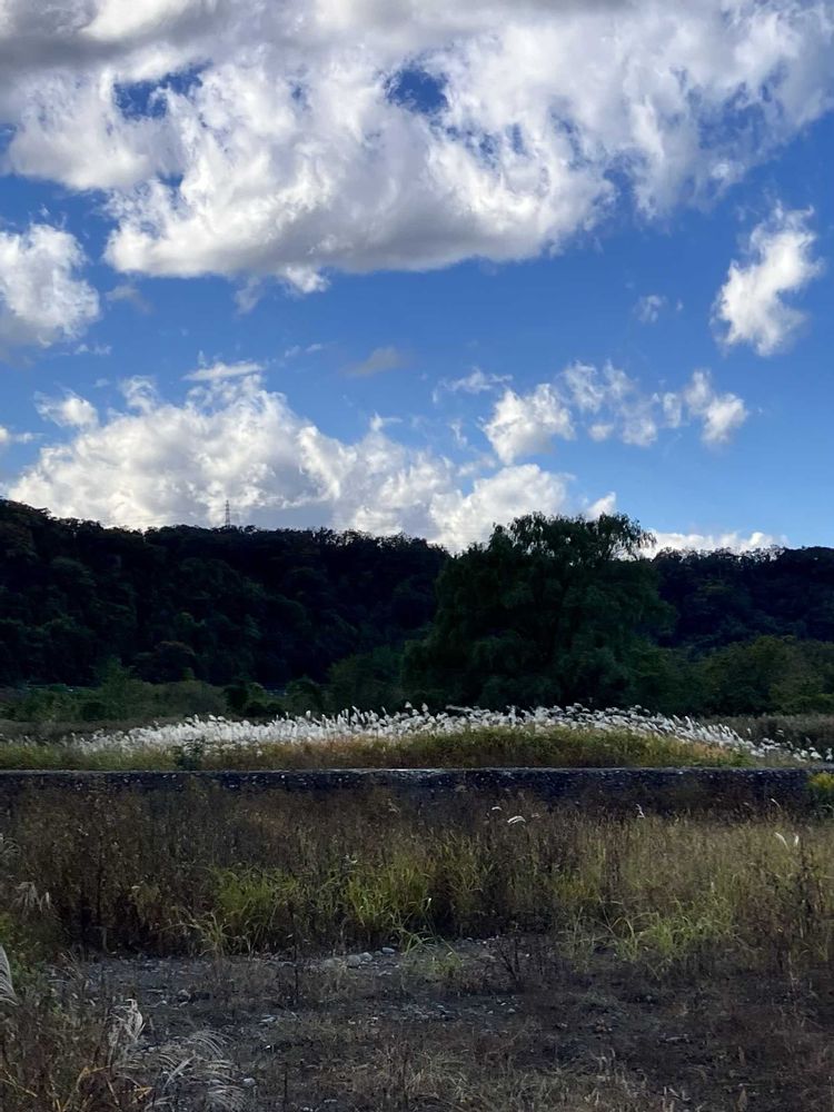 ①②すっかりお花も少なくなって、でも鮮やかな黄色やオレンジ、陽に透けるススキの秋色が河原を埋めています。