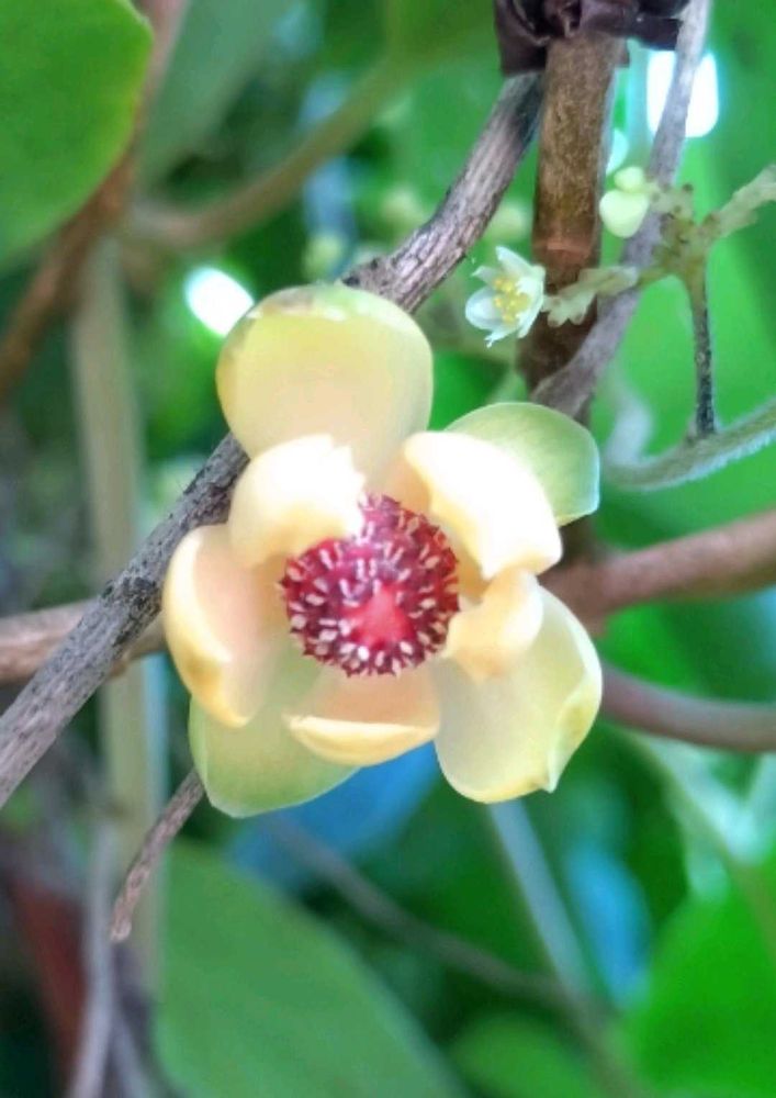 マツブサ科サネカズラ属の常緑つる性木本。山野に自生し、庭木や生け垣にも使われる。全縁に見える卵形の葉には通常まばらに鋸歯があるが、全縁の葉もあって混在する。常緑性だが、葉は寒さで紅葉する。花期は8月。淡黄色の小さな花が垂れ下がって咲く。雌雄異株だが両性株もある。雌花は雄花より小さい。雄花は赤球の雄しべが目立ち、雌花は緑白球の雌しべが目立つ。果実は丸い液果が20~30個集まって3㎝ほどの集合果となり秋に赤く熟す。1個の実の中に2~5個の種子が入る。白い実のシロミサネカズラもある。古いつるは丈夫で柔らかいので籠材や縄の代用として使われる。
