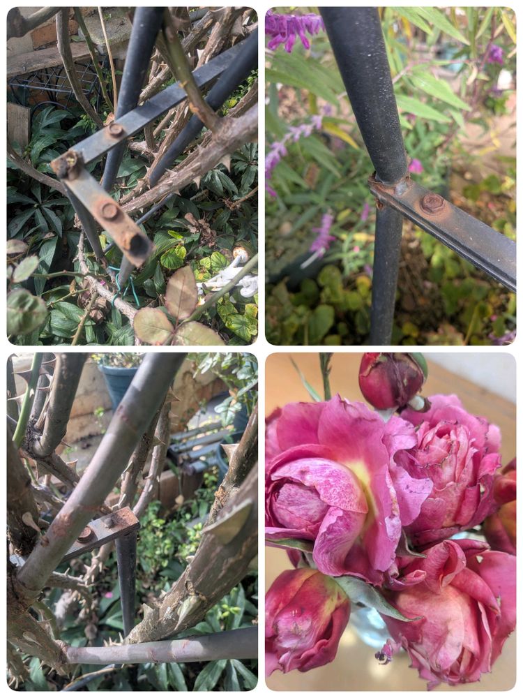 ⑤折れたアーチのジョイント部分😅と風で傷んでたけれど色付いてたフラマンローズ🌹まぁ〜開くのは無理だろうけれど捨てるのも忍びなくて😢