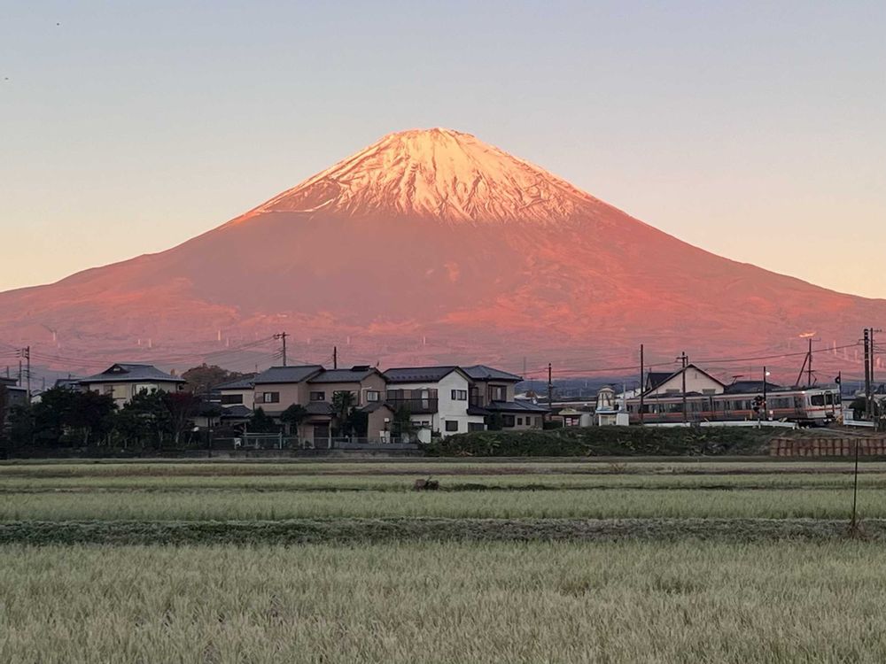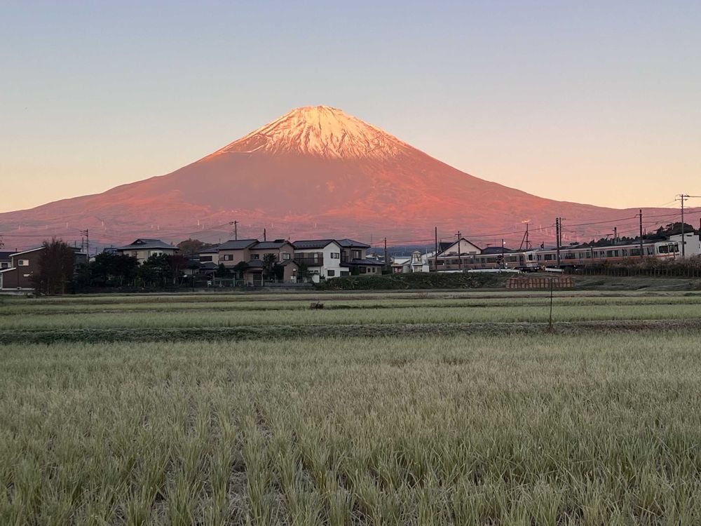 今朝の赤富士と御殿場線の電車、藁、夜明け前
