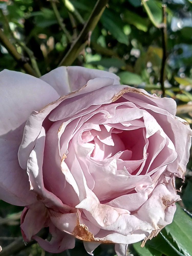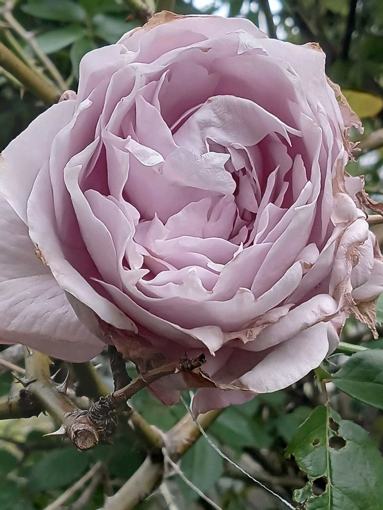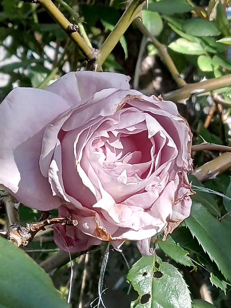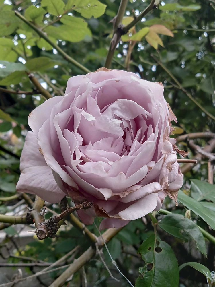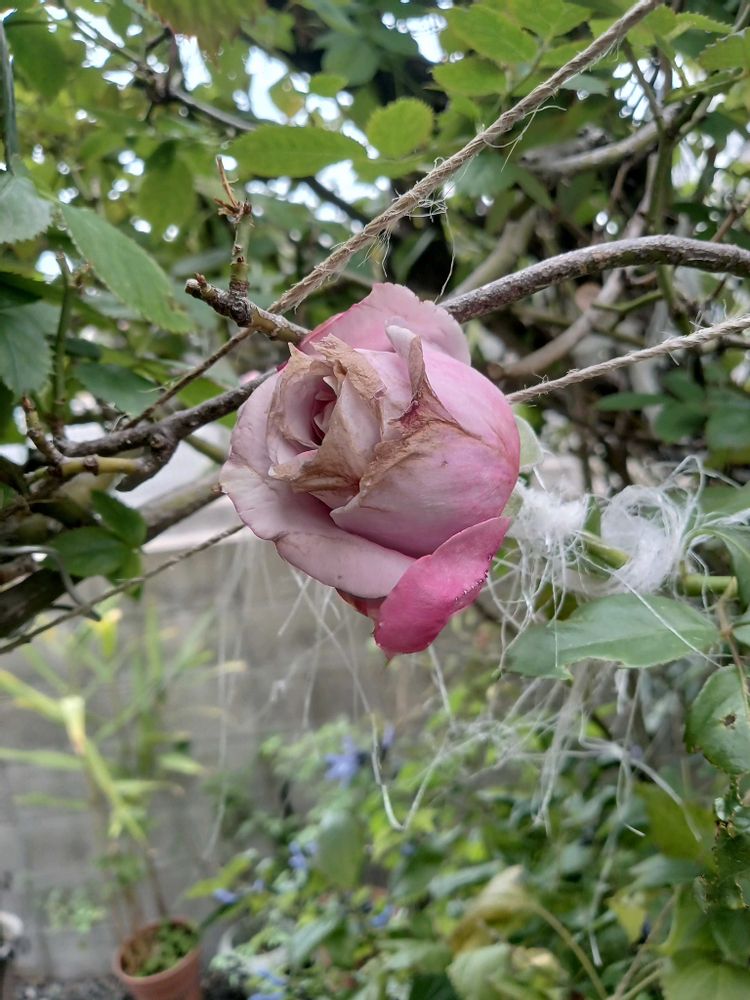薔薇ノヴァーリス、雨に当たって花びらが傷んでしまいちょっと残念ですが…香りが素晴らしいです✨️🩷💜🩷💜🩷🌹