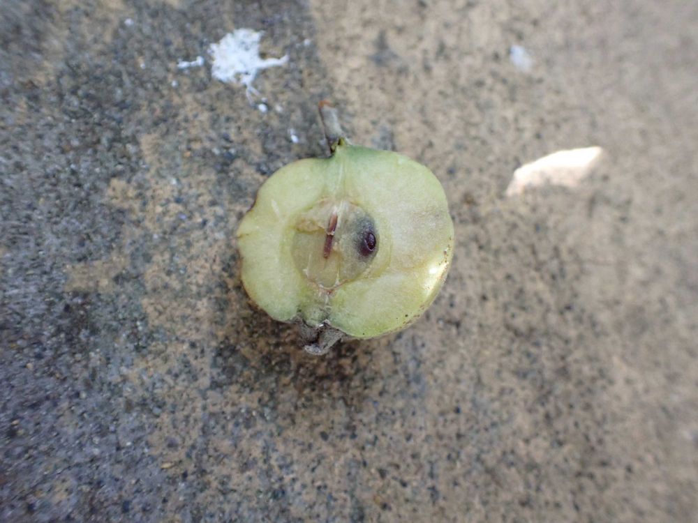 切ってみたら、ほんと、リンゴみたい。酸っぱいそうです。でも、美味しくありません。(③)