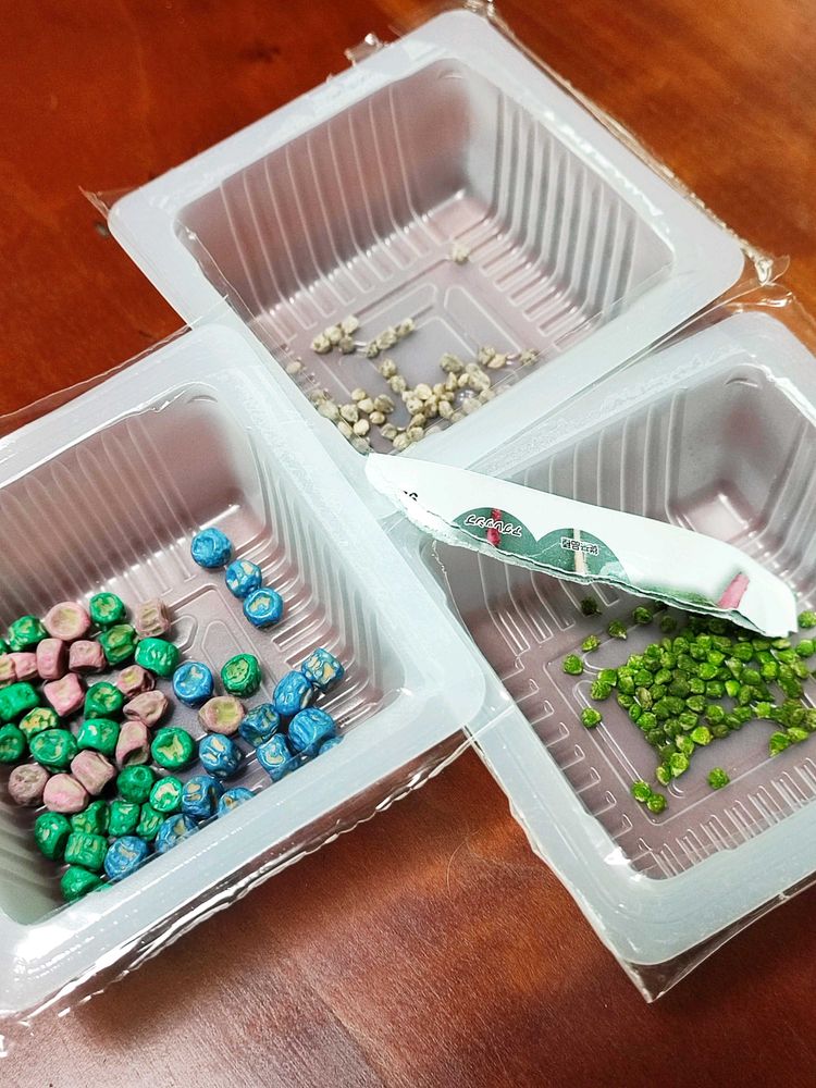 種は使い切れないので、ジップバッグに入れて冷蔵庫で保管してます。ラッキーなことに、今回全部の種の色が違うので、このまま芽出し処理します。ほうれん草は明日撒いて、スナップエンドウは根が出るまでは水につけておきます。