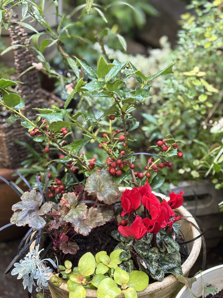 クリスマスからお正月にシフトしていける様な寄せ植えにしてるけどクリスマスホーリーはクリスマスだよね🎅
