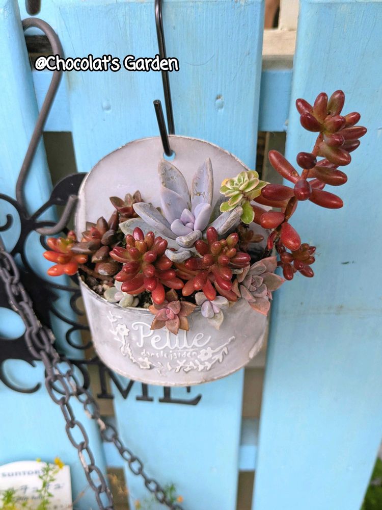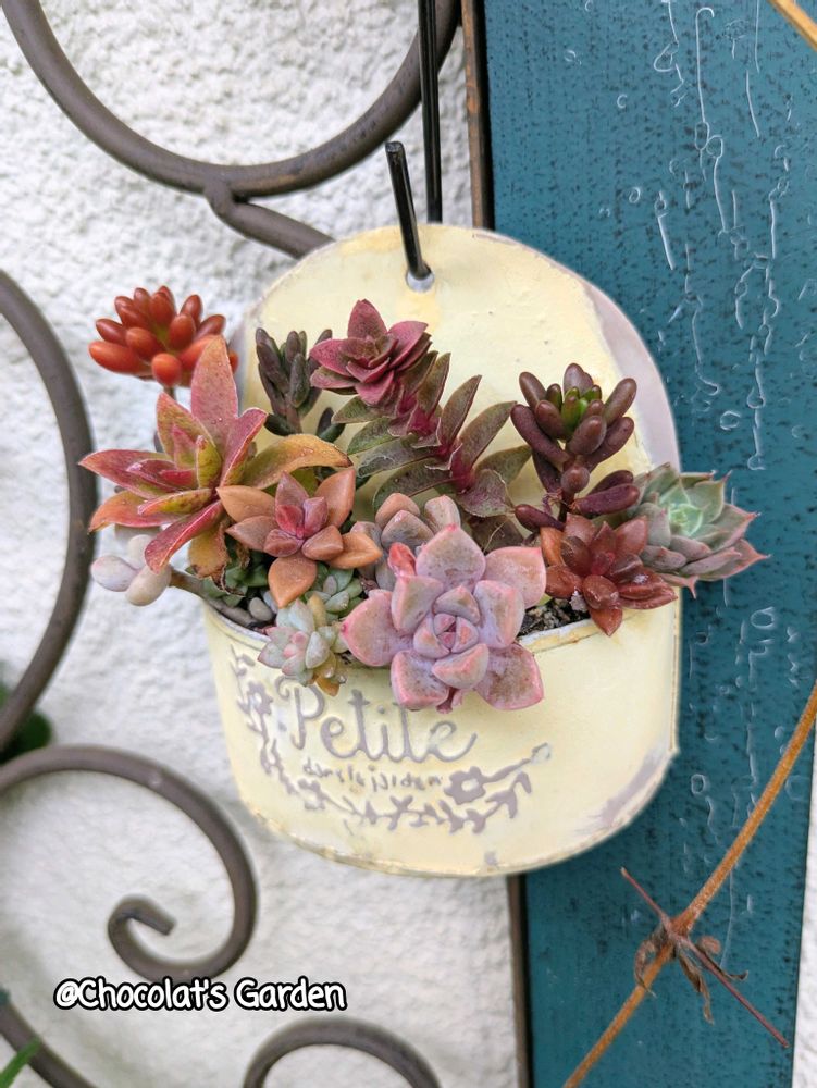 こちらはSeriaのブリキの器に寄せ植えしたもの