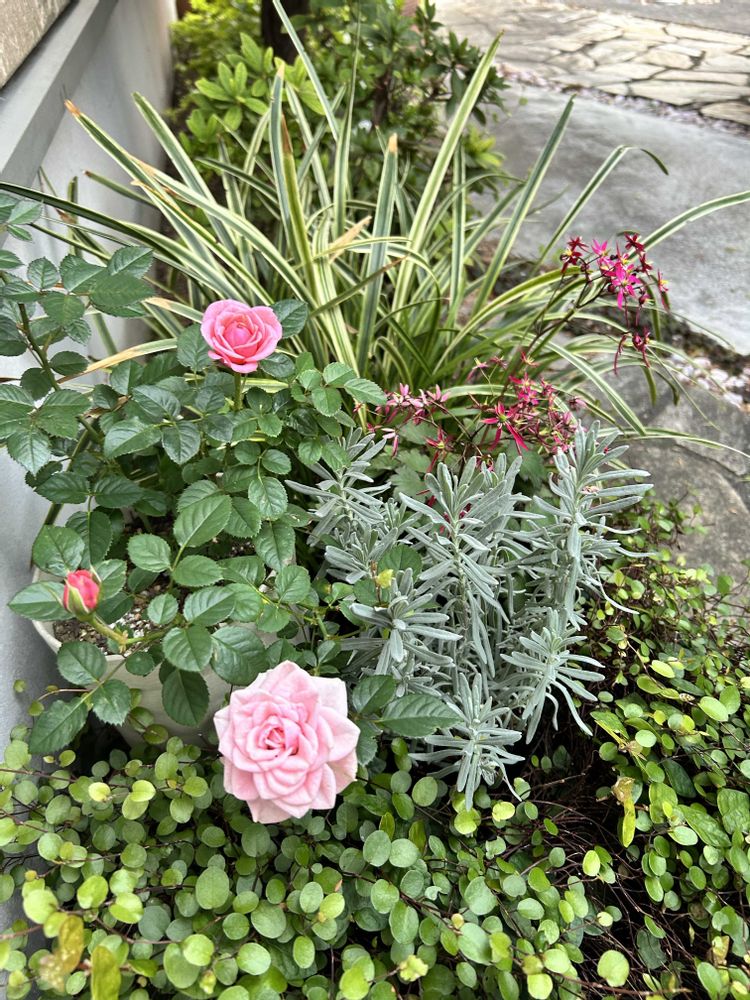 西洋大文字草が、ミニバラやラベンダーと意外と自然に馴染んでます。