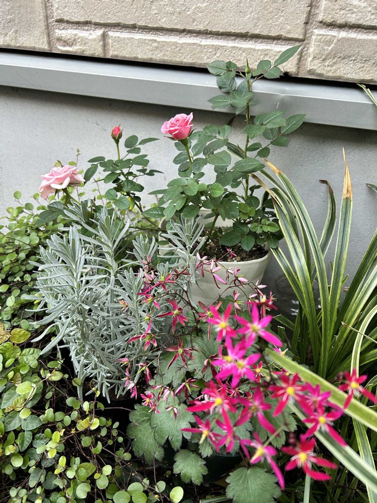 ミニバラの鉢が見えちゃってますが…、日当たりがそれほど無い場所なので、ローテーションで開花した鉢を入れ替えてるんです😊