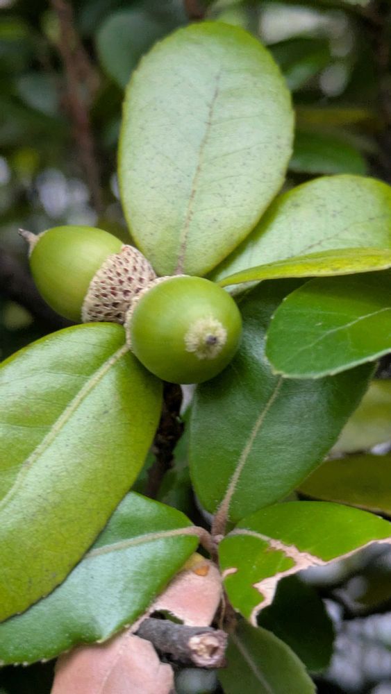 ③④ウバメガシ ブナ科 コナラ属 マンションの生垣で。真四く刈られてどんぐりの実が成ることを忘れていた。