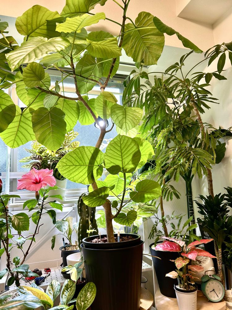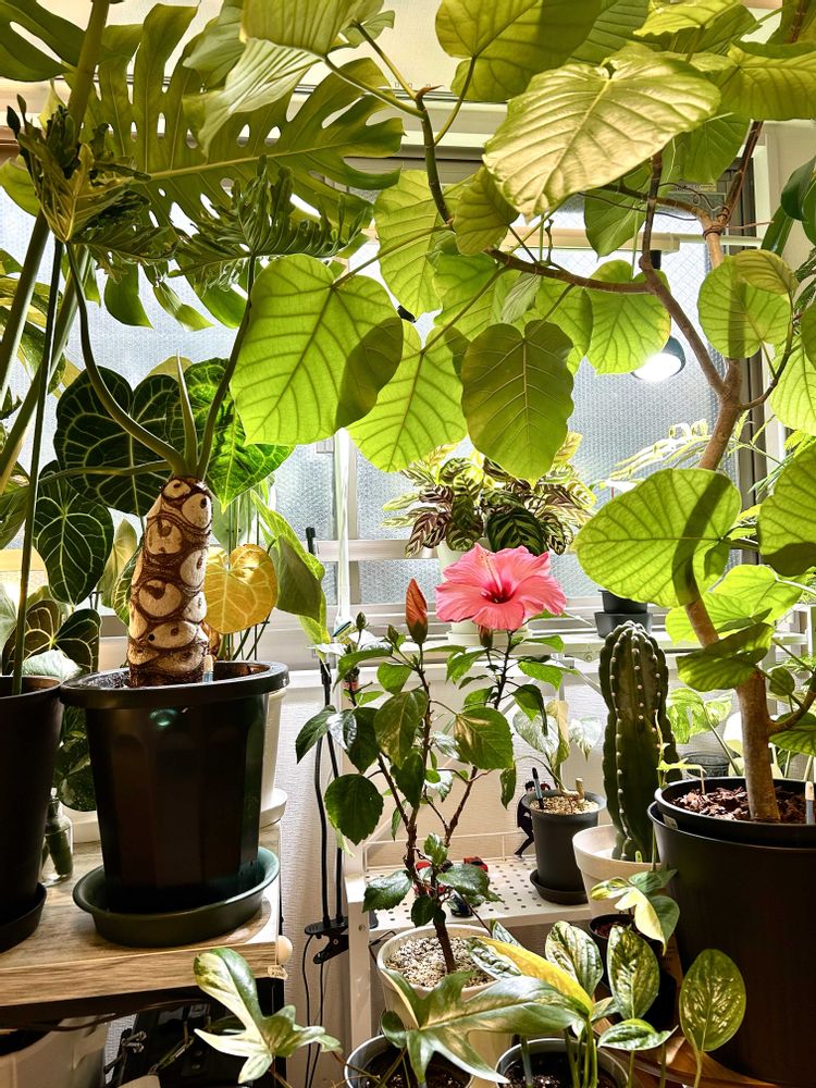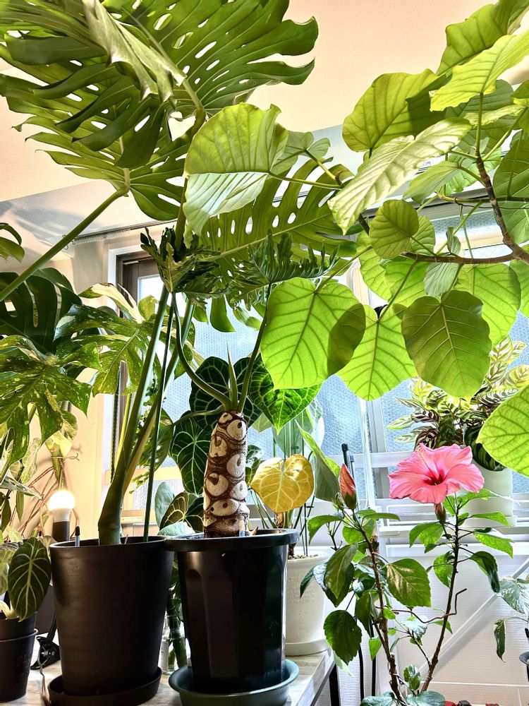 今日のハイビスカス🌺ロングライフシリーズアドニス😊フィロデンドロンセロームホープを配置換えして前面に持ってきました😊目玉オヤジ👀かわいい🩷❤️です〜