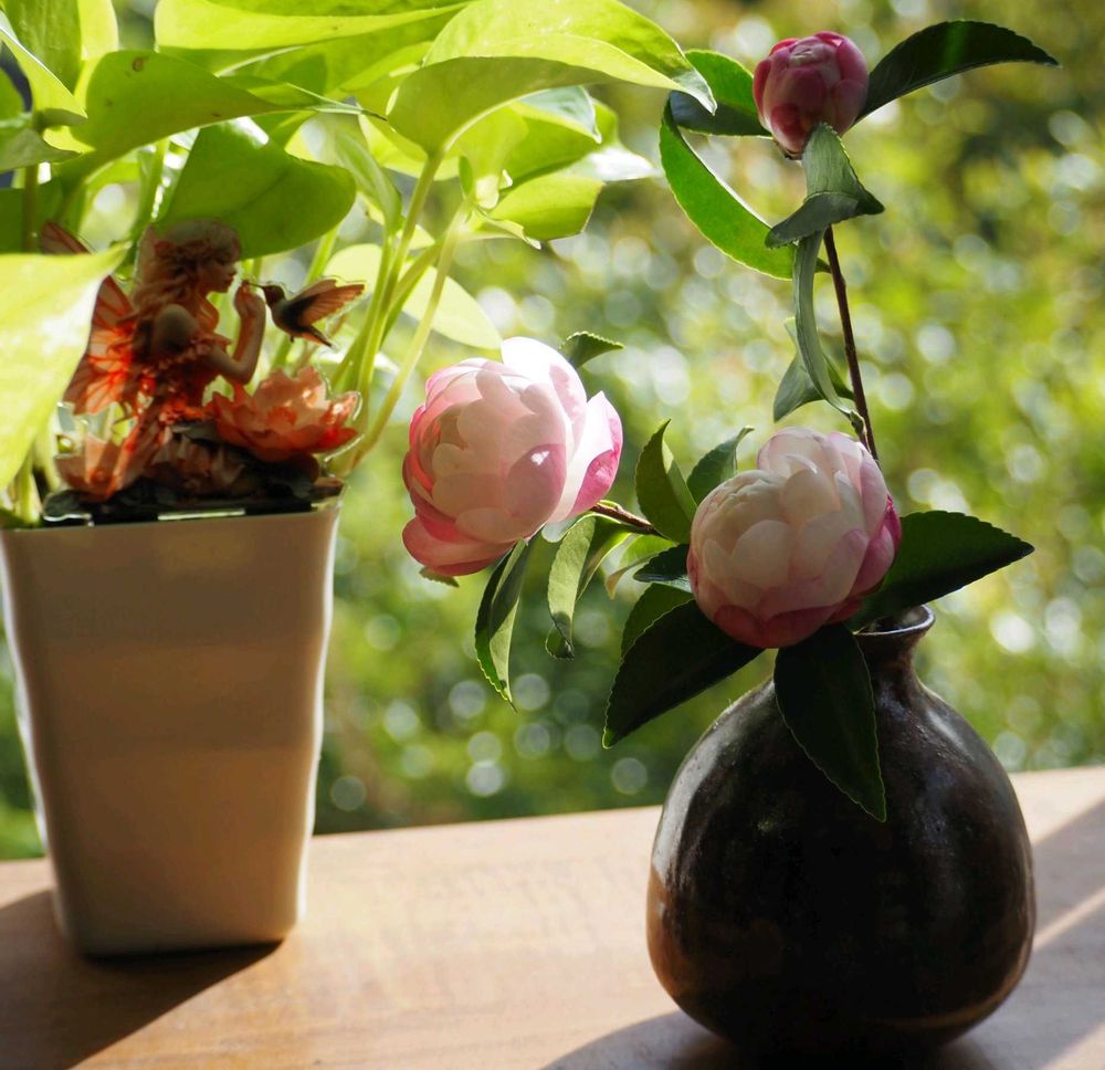 ➀山茶花とポトス𓂃◌𓈒窓辺に💚🩷